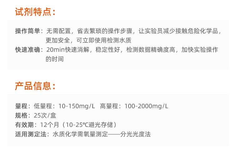 测试过程的便捷性、稳定性佳,延长存放时间;重现性好,准确度高,抗干扰能力强,采用进口高硼硅玻璃材质适用于各种多参数水质检测仪,作为绿色试剂,减少接触化学危险品的机会,确保操作人员的身体健康