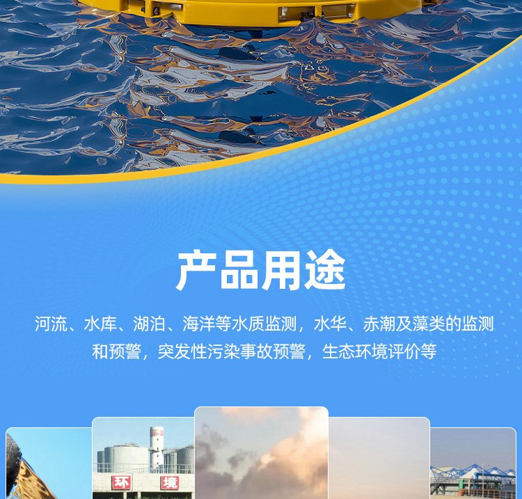 海洋浮标水质监测站可应用于海洋(河流、水库、湖泊等)水质监测,水华、赤潮及藻类的监测和预警,突发性污染事故预警,生态环境评价等。
