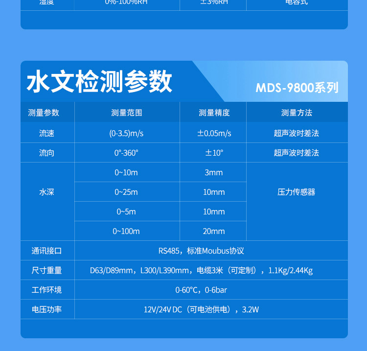 | 水深 | 压力传感器 | (0-10) m(0-25)m (0-50)m (0-100)m | 3mm 10mm 10mm 20mm |